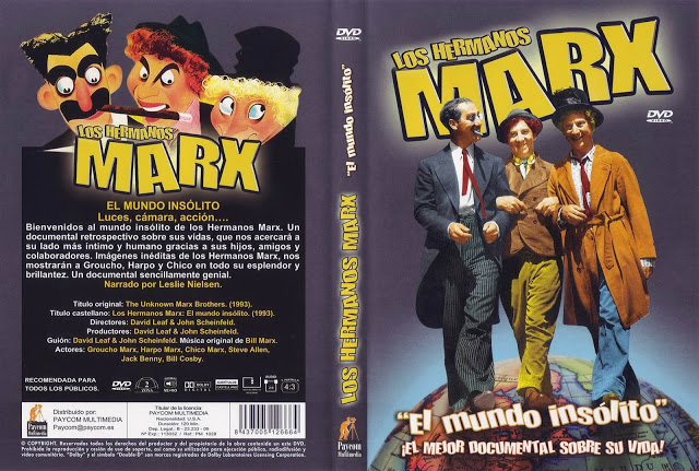 Unas precisiones sobre este documental cuyo verdadero nombre es The Unknown Marx Brothers que se traduce directamente, como El mundo desconocido (o insólito) de los Hermanos Marx; es el mismo documental que también ha sido difundido en España como Los irreverentes Hermanos Marx. No me pregunten el motivo de las alteraciones en el título, pero, en realidad, ni uno ni otro responden al contenido real de sus dos horas de metraje. De hecho, yo la bajé a través de emule con el título de Los desconocidos Hermanos Marx, pensando que iba a conocer la historia de Gummo y Zeppo, los hermanos desconocidos de Grucho, Harpo y Chico. Y tampoco. En realidad, va sobre lo que hicieron estos tres últimos Marx después de dejar de aparecer juntos en películas. Lo cual es también interesante, especialmente si tenemos en cuenta que esa trayectoria es completamente desconocida en España.